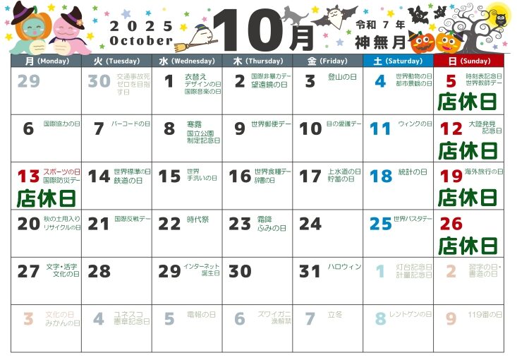 10月店休日のご案内 2025.10.4 店舗からのお知らせ みなさん、こんにちは。 神戸市須磨区・垂水区・長田区・西区・北区エリア、補聴器専門|須磨補聴器センター 店長の「のごさん」です。 秋が深まる10月、皆様いかがお過ごしでしょうか。 スポーツ、食欲、読書と、様々な楽しみがある季節ですね。 木々の彩りも深まり、紅葉の便りも聞こえ始めました。 朝晩は冷え込む日もございますので、どうぞご自愛ください。 須磨補聴器センター10月の店休日をお知らせします。 須磨補聴器センター 10月の店休日 ♣ 10月 5日(日) 店休日 ♣ 10月12日(日) 店休日 ♣ 10月13日(月) 店休日(スポーツの日) ♣ 10月19日(日) 店休日 ♣ 10月26日(日) 店休日 10月は、上記5日間をお休みさせていただきます。 須磨補聴器センターでは、補聴器を購入前に4週間しっかり試すことができる 『購入前のお試し』 実施中!!! お店への行きかた ☎ 電話でのお問い合わせ 『安心のお試し』 店舗からのお知らせ 定休日のご案内, 5月 高性能な補聴器をお求めやすく前の記事