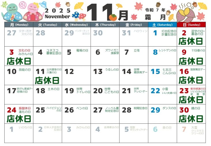 11月店休日のご案内 2025.11.1 店舗からのお知らせ みなさん、こんにちは。 神戸市須磨区・垂水区・長田区・西区・北区エリア、補聴器専門|須磨補聴器センター 店長の「のごさん」です。 11月に入り、秋も深まってまいりました。木々が色づき、紅葉の美しい季節がやってきますね。 最近は、朝晩の冷え込みも厳しくなってきましたが、皆様いかがお過ごしでしょうか。 読書、スポーツ、アートなど、秋の楽しみ方は様々です。 温かい飲み物を片手に、心温まる秋のひとときをお過ごしください。 須磨補聴器センター11月の店休日をお知らせします。 須磨補聴器センター 11月の店休日 ♣ 11月 2日(日) 店休日 ♣ 11月 3日(月) 店休日(文化の日) ♣ 11月 9日(日) 店休日 ♣ 11月11日(火) 店休日(臨時休業) ♣ 11月16日(日) 店休日 ♣ 11月23日(日) 店休日(勤労感謝の日) ♣ 11月24日(日) 店休日(振替休日) ♣ 11月30日(日) 店休日 11月は、上記8日間をお休みさせていただきます。 只今、須磨補聴器センターでは「高性能な補聴器をお求めやすく」をコンセプトに 取扱い補聴器 全品 49%~10%引き 【最新のAI搭載補聴器】や【超小型の充電式補聴器】も大幅値下げ中! 予約のお電話はこちらへ ▼ ご予約専用フリーダイヤル ☎ 0120-094133 お店への行きかたはこちら ▼ お店への行きかた 店舗からのお知らせ 2025年11月, 定休日のご案内 10月店休日のご案内前の記事