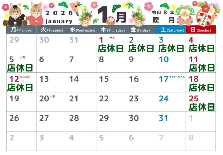 1月店休日のご案内 2025.12.27 店舗からのお知らせ みなさん、こんにちは。 神戸市須磨区・垂水区・長田区・西区・北区エリア、補聴器専門|須磨補聴器センター 店長の「のごさん」です。 2025年も格別のご愛顧を賜り、誠にありがとうございます。 皆様のおかげで無事にお店も年末を迎えることができました。 引き続き、より良いサービスと商品を提供できるよう努めてまいります。 来年も変わらぬご支援をお願い申し上げます。 どうぞ良いお年をお迎えください。 須磨補聴器センター1月の店休日をお知らせします。 須磨補聴器センター 1月の店休日 ♣ 1月 1日(木) 店休日(元日) ♣ 1月 2日(金) 店休日(年末年始休業) ♣ 1月 3日(土) 店休日(年末年始休業) ♣ 1月 4日(日) 店休日 ♣ 1月 5日(月) 店休日(年末年始休業) ♣ 1月11日(日) 店休日 ♣ 1月12日(月) 店休日(成人の日) ♣ 1月18日(日) 店休日 ♣ 1月25日(日) 店休日 1月は、上記9日間をお休みさせていただきます。 只今、須磨補聴器センターでは「高性能な補聴器をお求めやすく」をコンセプトに 取扱い補聴器 全品 49%~10%引き 【最新のAI搭載補聴器】や【超小型の充電式補聴器】も大幅値引き中! 詳細は予約のうえ、お店でご確認ください 予約のお電話はこちらへ ▼ ご予約専用フリーダイヤル ☎ 0120-09-4133 お店への行きかたはこちら ▼ お店への行きかた 店舗からのお知らせ 2025年11月, 定休日のご案内 最新の補聴器がお得に買える!前の記事